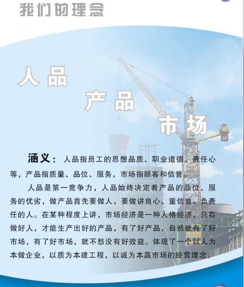 人品是第一競爭力,人品始終決定著產(chǎn)品的品位,服務(wù)的優(yōu)劣,做產(chǎn)品首先要做人,要做講良心、重信譽(yù)、負(fù)責(zé)任的人,在某種程度上講,市場經(jīng)濟(jì)是一種人格經(jīng)濟(jì),只有做好人,才能生產(chǎn)出好的產(chǎn)品,有了好產(chǎn)品,自然就有了好市場,有了好市場,就不愁沒有好效益。體現(xiàn)了一個以人為本做企業(yè),以質(zhì)為本建工程,以誠為本贏市場的經(jīng)營理念。