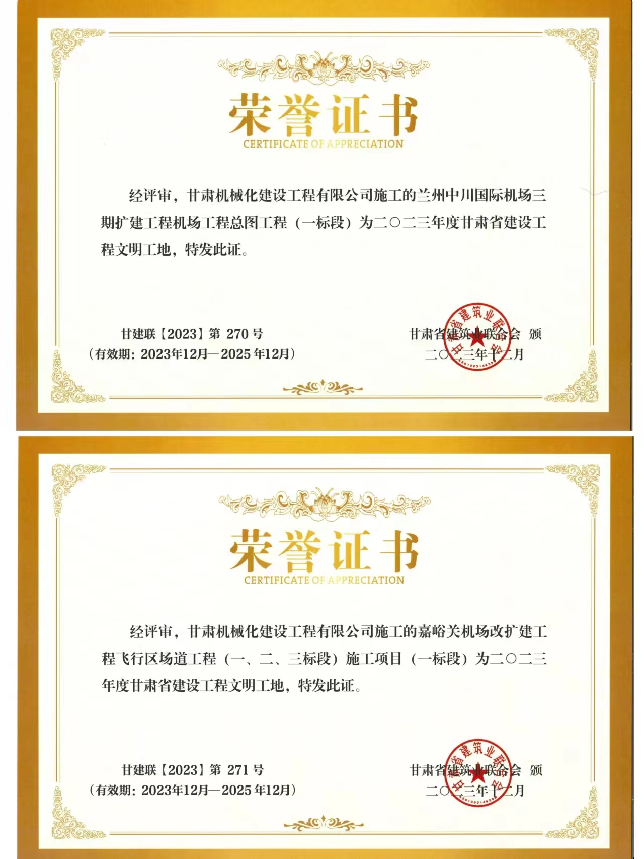 近日,我司承建的蘭州中川國際機(jī)場二期擴(kuò)建工程機(jī)場工程總圖工程 (一標(biāo)段)與嘉峪關(guān)機(jī)場改擴(kuò)建工飛行區(qū)場道(一、二、三標(biāo)段) 施工項(xiàng)目 (一標(biāo)段) 獲得2023年度甘肅省建設(shè)工程文明工地榮譽(yù)稱號。