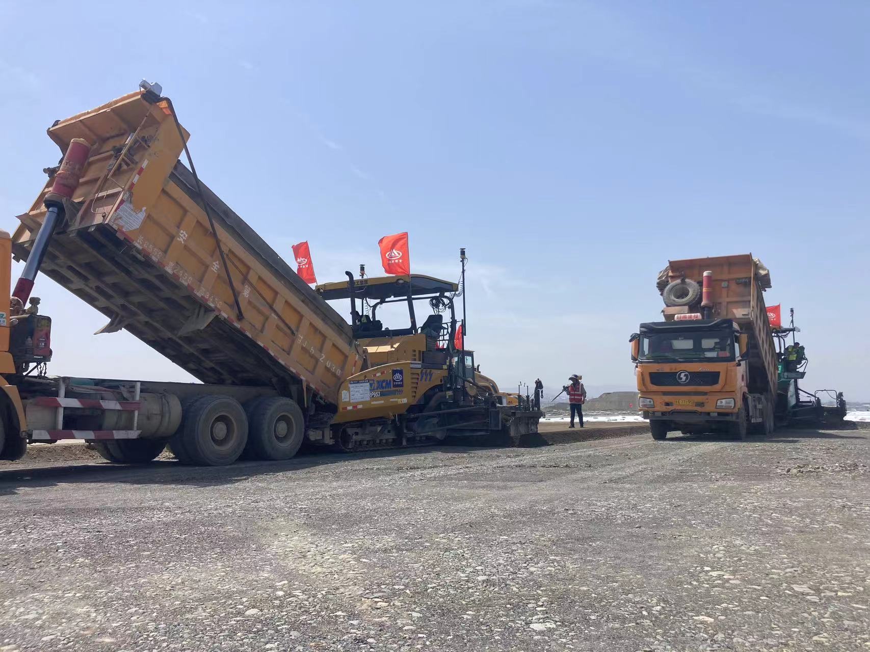 為保證攤鋪順利進行,項目部前期做好各項準備工作,在施工過程中,嚴格把控施工環(huán)節(jié),確保攤鋪施工銜接有序,高效優(yōu)質,一次成型,并使用mmGPS 3D攤鋪技術進行兩機聯鋪。